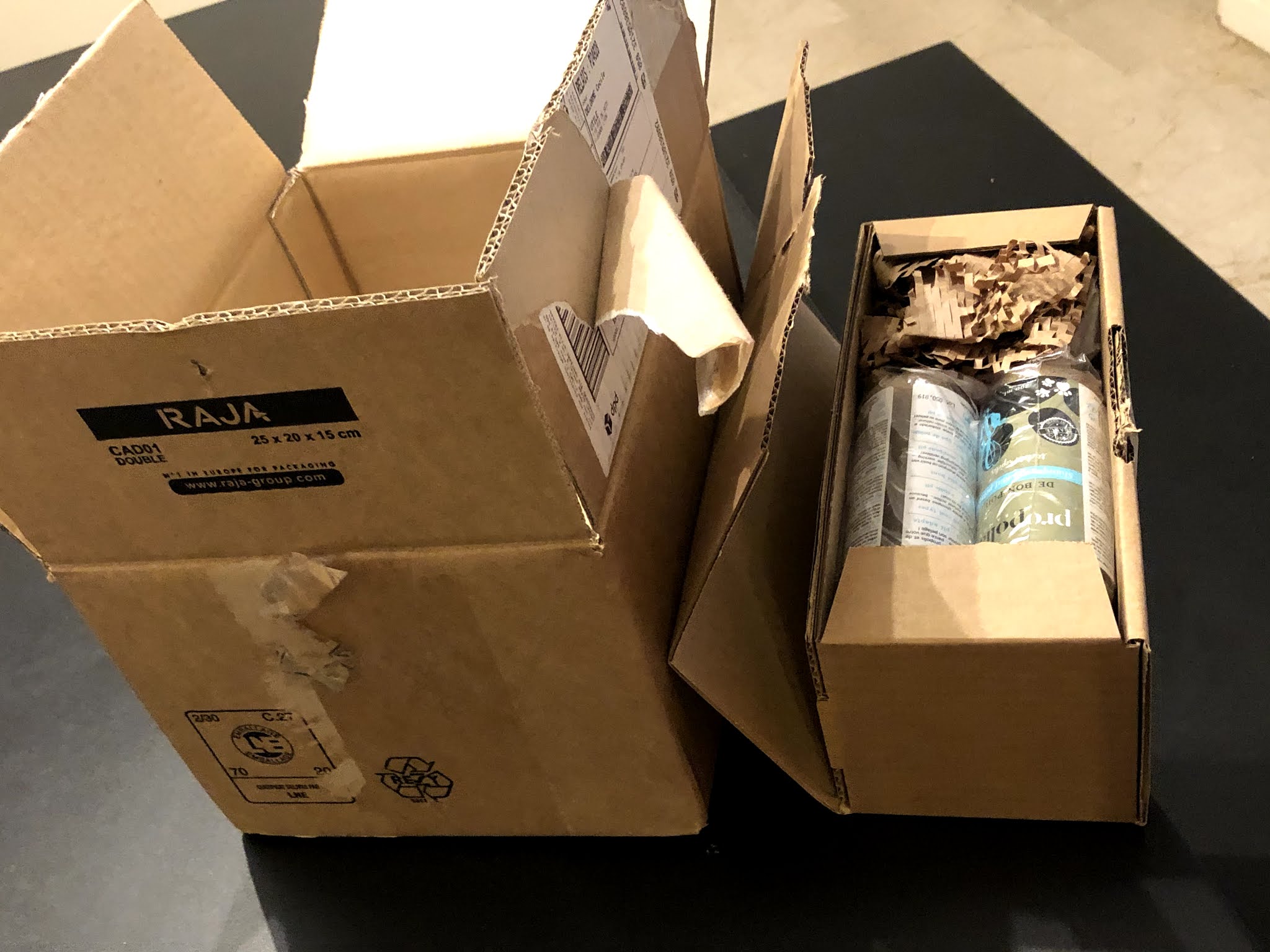 Je suis satisfaite des produits que j'achète, cependant je trouve qu'ils sont sur-emballés. J'ai passé commande pour 4 shampoings, ce qui n'est pas fragile, et ils ont été envoyés dans deux cartons. Le plus petit aurait amplement suffi.